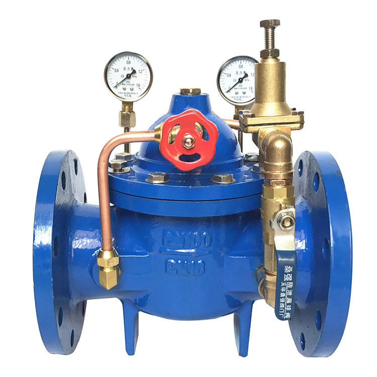 当阀门从进口端给水时,水流过针阀进入主阀控制室,出口压力通过导阀作用到导阀上。当出口压力高于导阀弹簧设定值时,导阀关闭。控制室停止排水。此时主阀压力控制室内,压力升高并关闭主阀、出口压力不在升高。